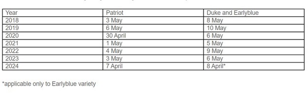 Jedną z najwcześniejszych odmian borówki jest „Patriot”. W normalnych latach zaczyna kwitnąć zwykle na początku maja, ale w tym roku – od 7 kwietnia. Odmiany borówki Earlyblue i Duke zwykle kwitną natychmiast po patriotyzmie. Według danych historycznych zebranych przez pana Mirosława, w normalnych latach miało to miejsce od 5 do 10 maja. W tym roku odmiana Early Blue zaczęła kwitnąć 8 kwietnia. Duke jeszcze nie zakwitł, ale zacznie kwitnąć za kilka dni.